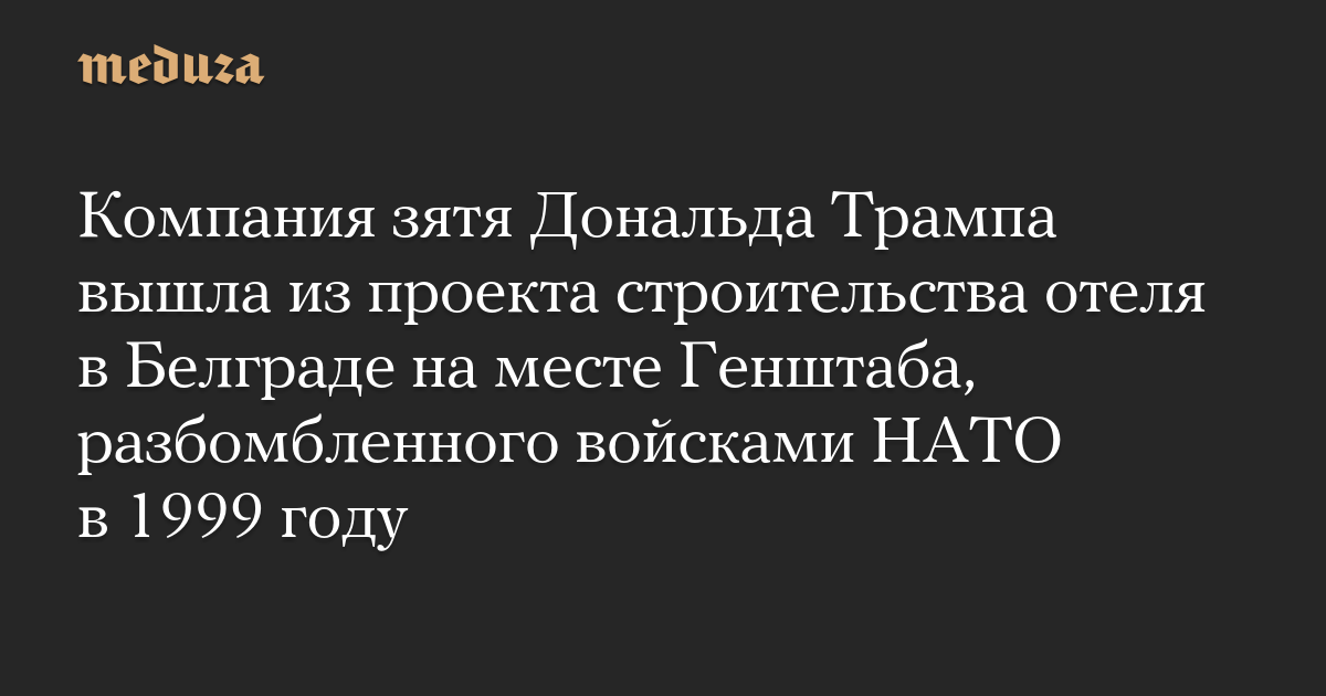 Инвестиционная компания Affinity Partners Development, принадлежащая зятю Дональда Трампа Джареду Кушнеру, объявила о выходе из проекта строительства отеля в Белграде на месте Генштаба, разбомбленного войсками НАТО в 1999 году. Соответствующее объявление, пишет The New York Times, компания Кушнера сделала после того, как белградская прокуратура пре…